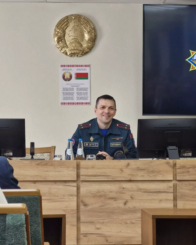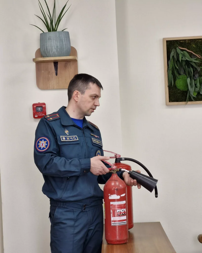 The employees were introduced to the procedure to follow in the event of a fire and practiced safe evacuation skills. After the practical training, a detailed fire safety discussion was held with the participation of Pavel Petkevich, Deputy Head of the Partizansky District Department of the Ministry of Emergency Situations.