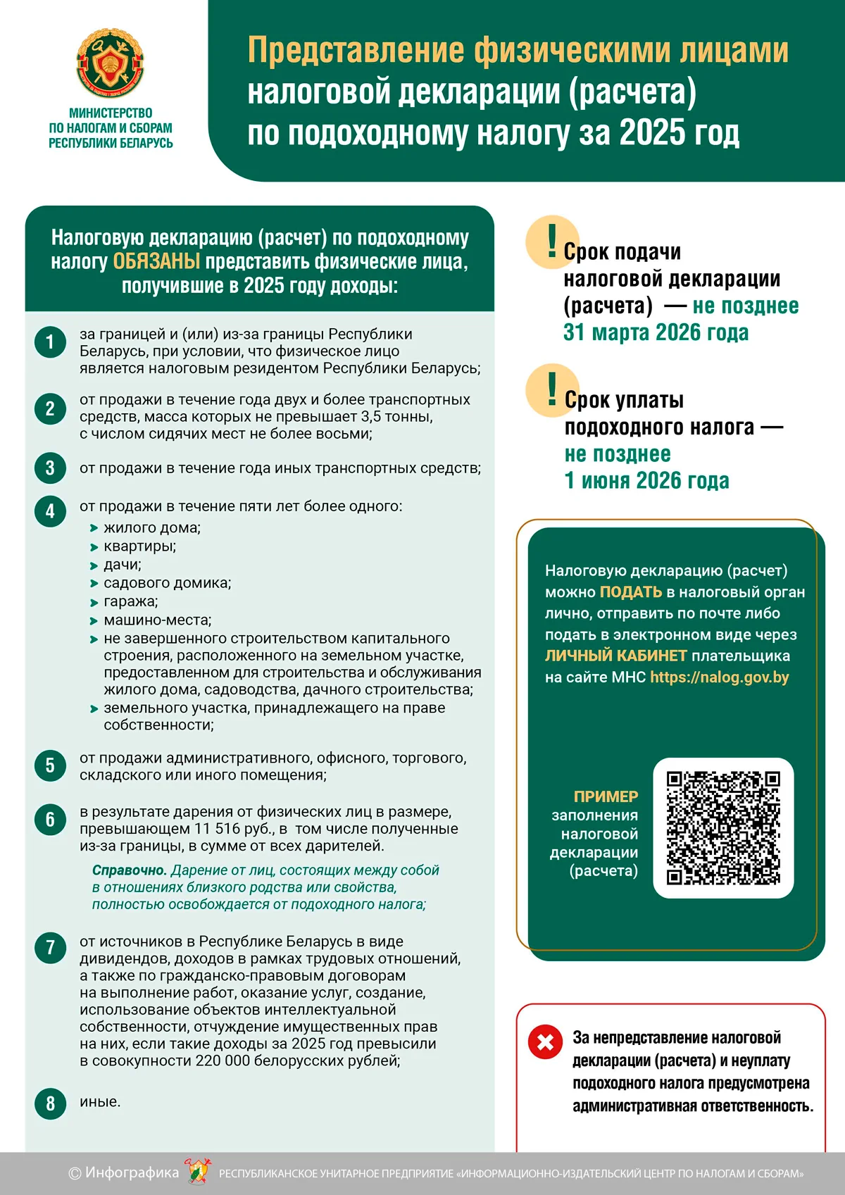 - от источников в Республике Беларусь в виде дивидендов, доходов в рамках трудовых отношений, а также по гражданско-правовым договорам на выполнение работ, оказание услуг, создание, использование объектов интеллектуальной собственности, отчуждение имущественных прав на них, если такие доходы за 2025 год превысили в совокупности 220 000 белорусских рублей;